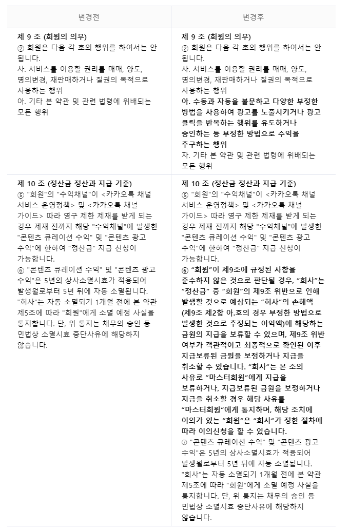 금일 부터 카카오뷰 정산약관이 아래와 같이 변경 되었습니다. 변경 전과 변경 후를 확인 하시기 바랍니다. 가장 중요한 부분은 수동이든 자동이든 모든 부정적인 광고 클릭에 대한 내용이니 이 점 참고하세요.