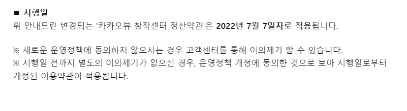 이렇게 변경된 카카오뷰 창작센터 정산약관은 2022년 7월 7일자로 적용된다고 합니다. 6월에 수익 내역이 7월 25일이 정산일인만큼 6월 수익 내역부터 적용된다고 고려하시는게 안전할 것 같습니다.