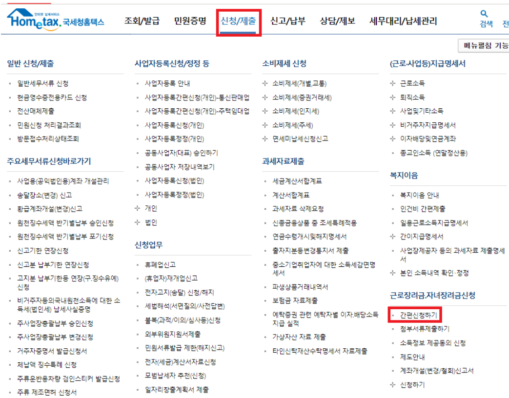 국세청 홈택스 -> (상단) 신청/제출 -> (우측하단) 근로장려금,자녀장려금신청 -> 간편신청하기 클릭